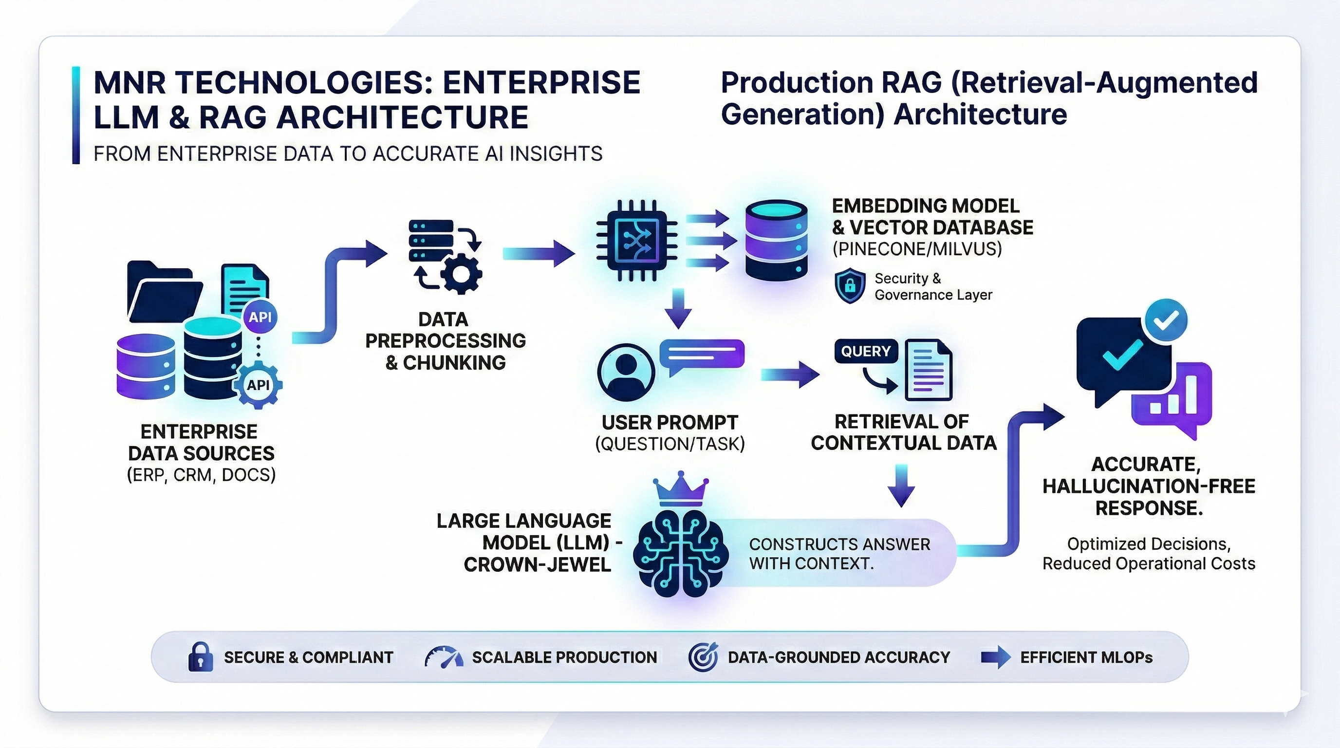 MNR Technologies bridges the gap between experimental AI and production-grade software. We specialize in Retrieval-Augmented Generation (RAG), ensuring your models provide answers grounded strictly in verified organizational data.